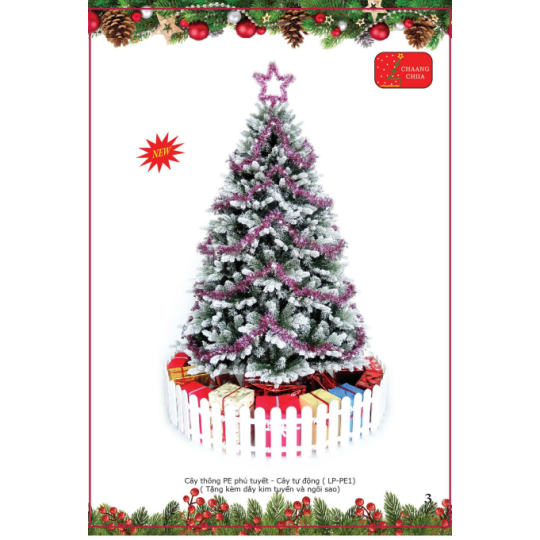 Mô tả: Cây thông 3 loại lá : đầu cước, đầu nhọn phun sơn và đầu tròn 2 in gắn trái đỏ