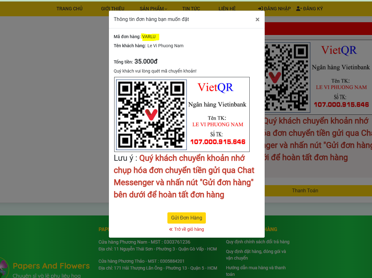 Bước 12 : Chuyển khoản nhờ ghi nội dung mã đơn hàng hoặc số điện thoại và sau đó nhấn nút " Gửi đơn hàng" để hoàn tất gửi đơn